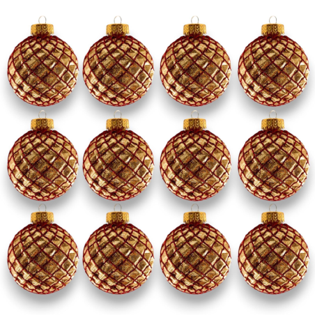 Design elegante: Set di 12 palline natalizie dorate con un raffinato motivo a rete rossa per un tocco di classe alle tue decorazioni.