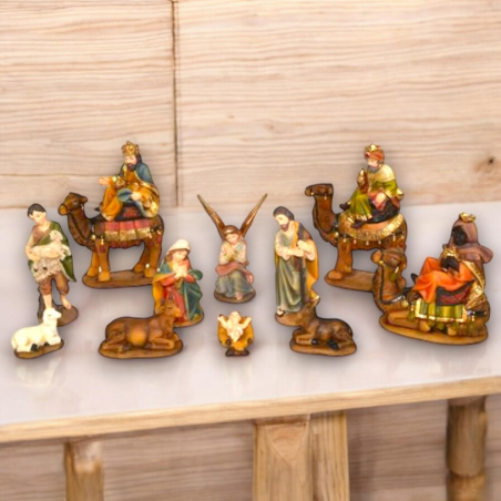 Set di11 Statuine: Include Giuseppe, Maria, il Bambino Gesù, un angelo, un pastore, tre Re Magi su cammelli, una pecorella, un bue e un asinello.