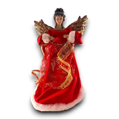 Abiti eleganti: Ogni angelo è vestito con abiti riccamente decorati in tessuto rosso, ornati con dettagli dorati, pizzi e nastri.